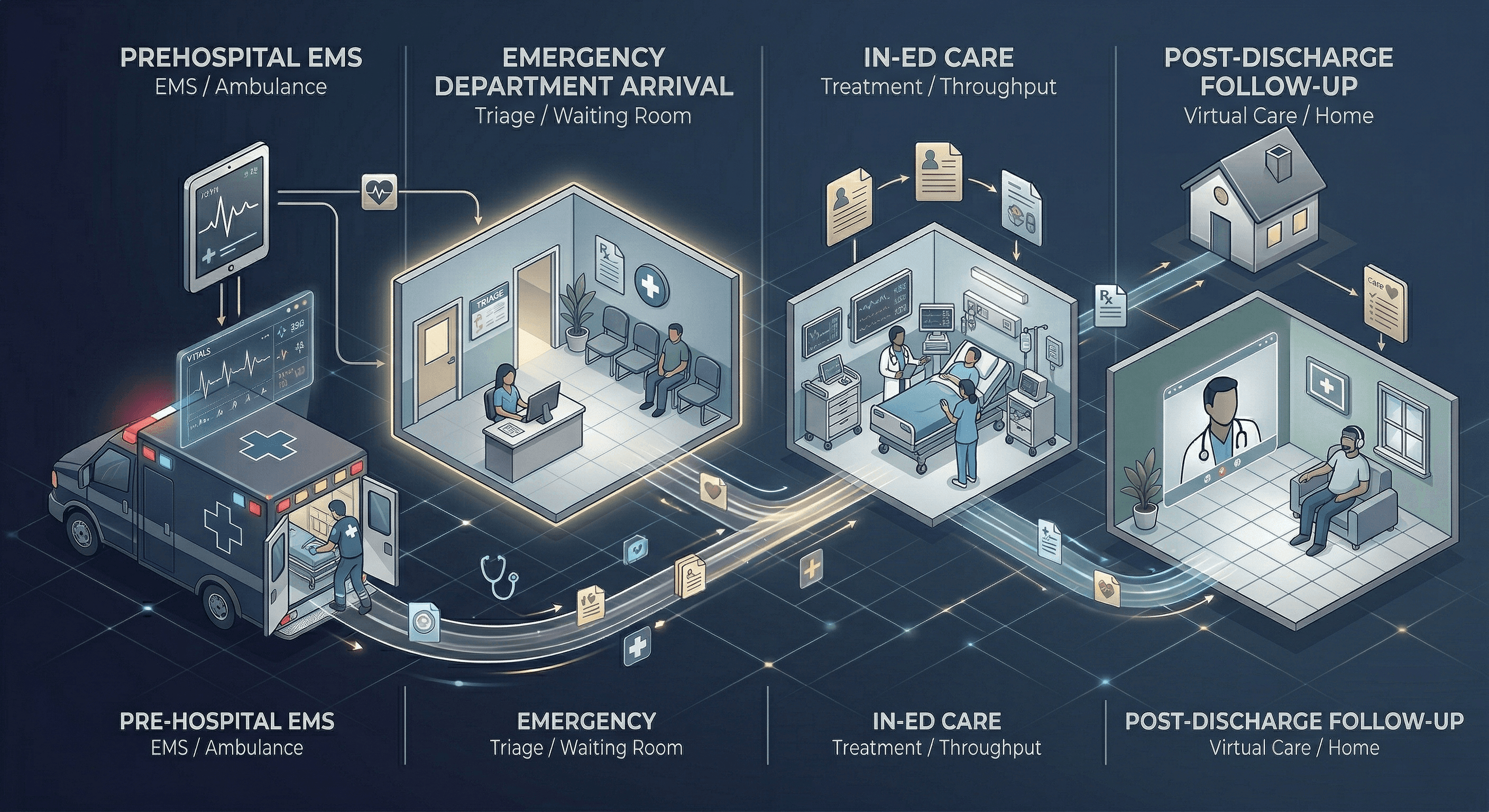 We help health systems redesign emergency care flow using physician-led virtual care models across the continuum: from prehospital triage to ED arrival, in-ED throughput, and post-discharge follow-up.